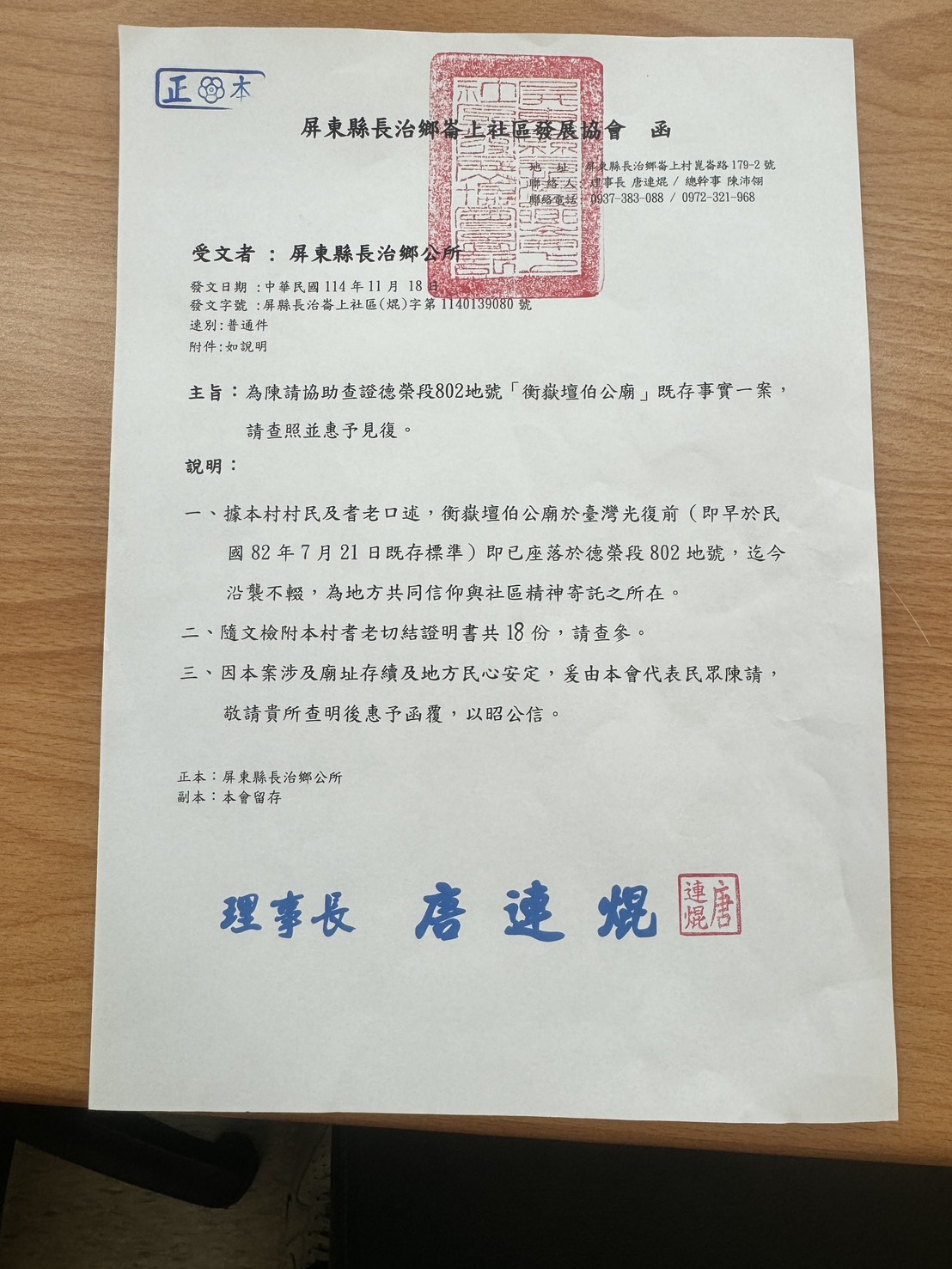 11月25日10 時鄉長接待崙上社區發展協會來訪陳情衡嶽壇伯公廟既存事實ㄧ案,鄉長聽取社區耆老敘明原