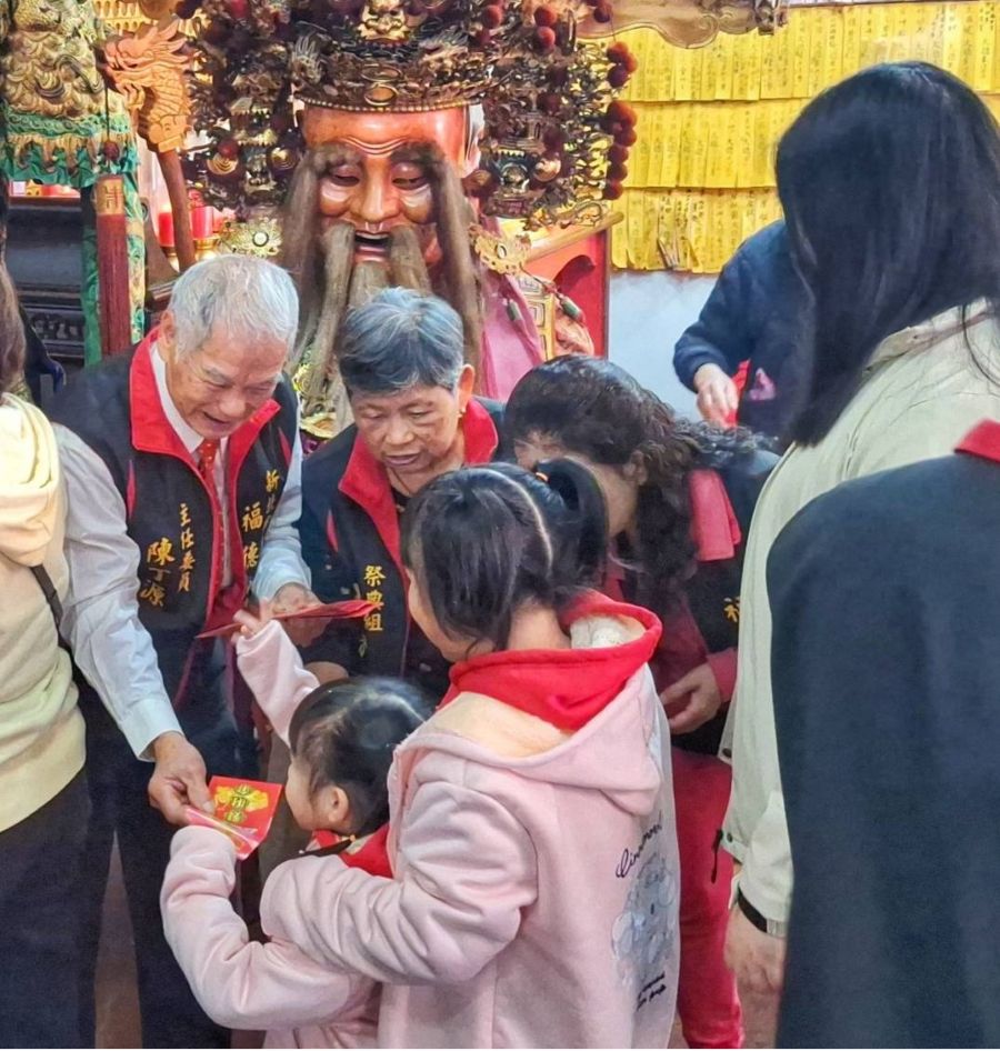 ▲主任委員陳丁源農曆大年初一新春團拜後發放經過神明加持後開運發財金溫馨感人畫面。(圖/烏來福德宮提供)