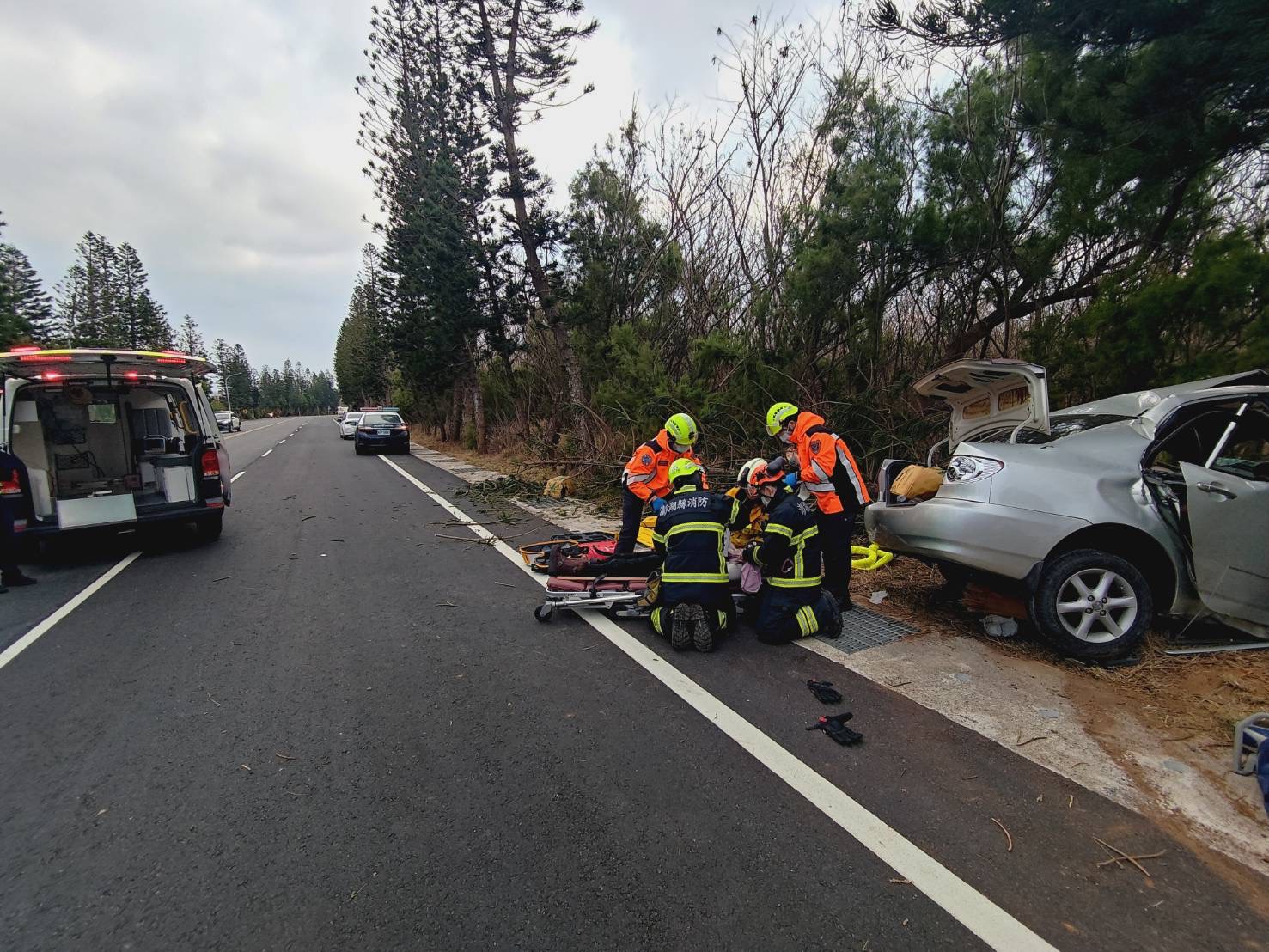 澎湖赤崁村長夫妻車子撞路樹消防隊員到場救援。翻攝畫面