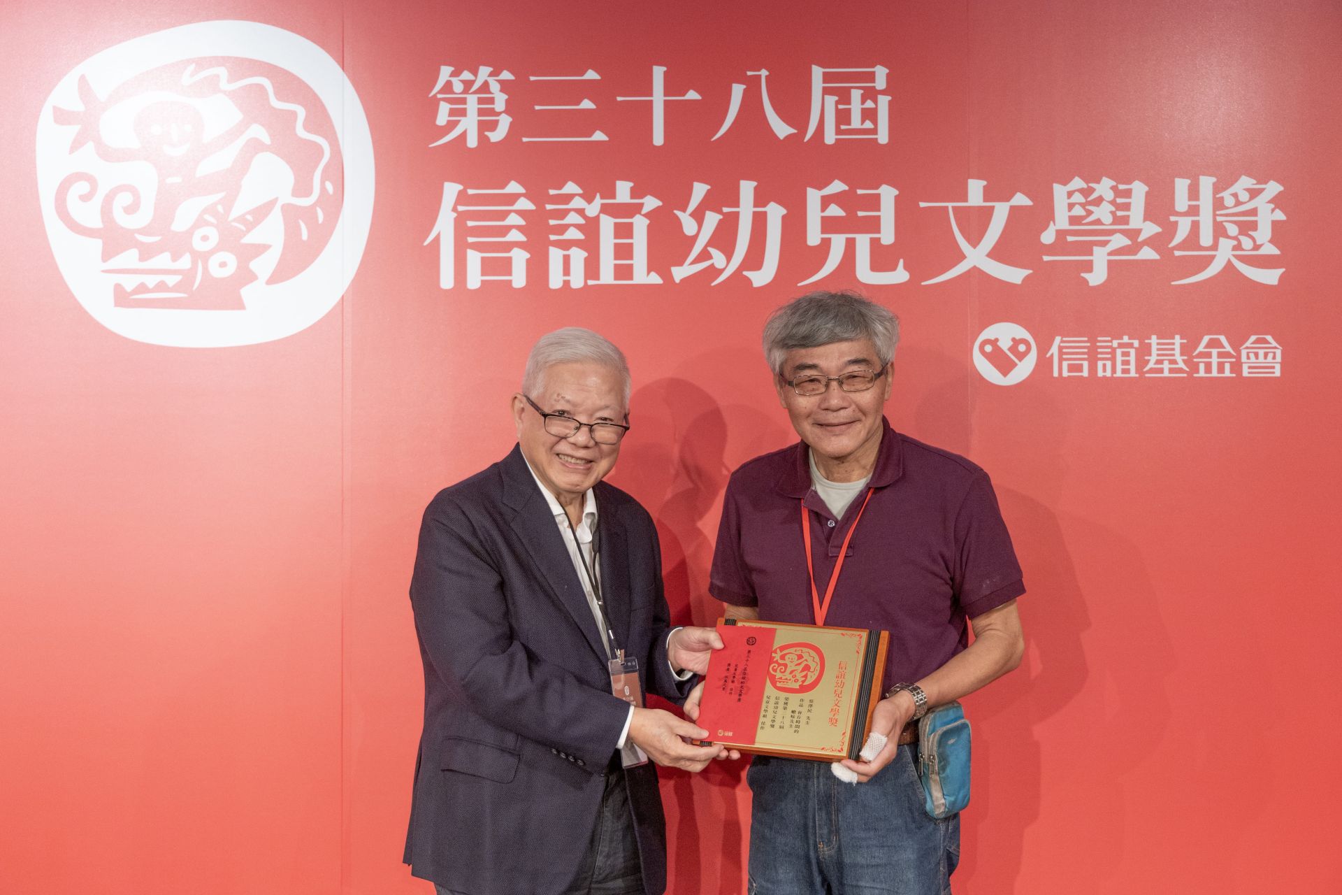 ▲信誼基金會共同創辦人何壽川頒發兒童文學佳作予70歲的退休教授蔡澤民。(圖/信誼基金會提供)